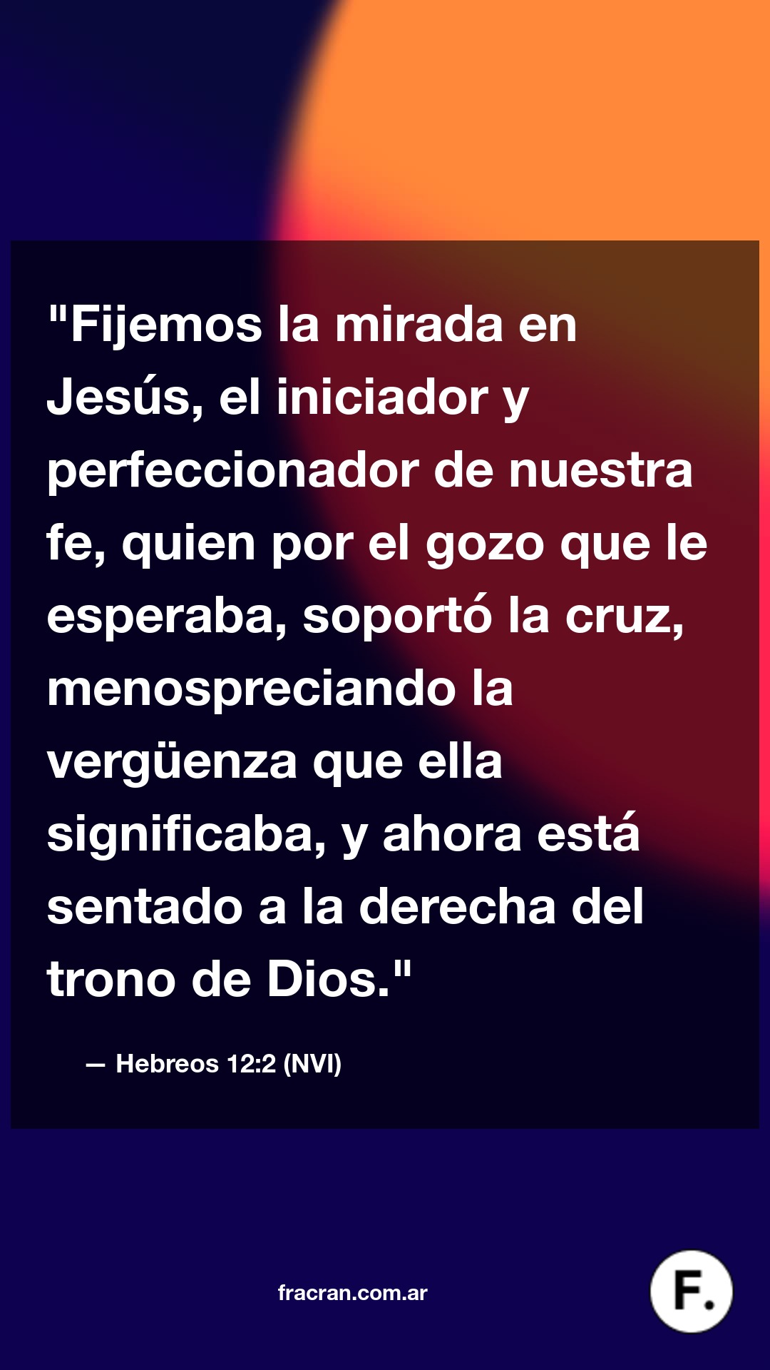 "Fijemos la mirada en Jesús, el iniciador y perfeccionador de nuestra fe, quien por el gozo que le esperaba, soportó la cruz, menospreciando la vergüenza que ella significaba, y ahora está sentado a la derecha del trono de Dios."