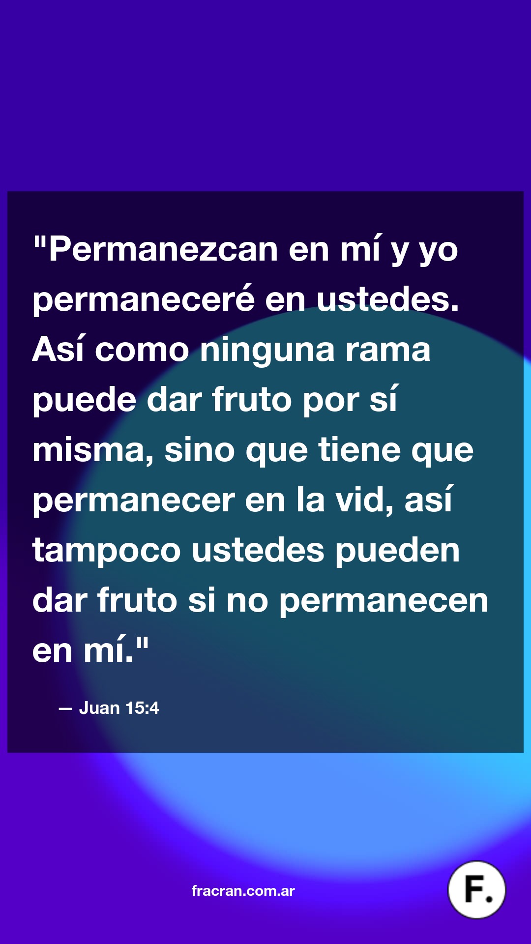 "Permanezcan en mí y yo permaneceré en ustedes. Así como ninguna rama puede dar fruto por sí misma, sino que tiene que permanecer en la vid, así tampoco ustedes pueden dar fruto si no permanecen en mí."