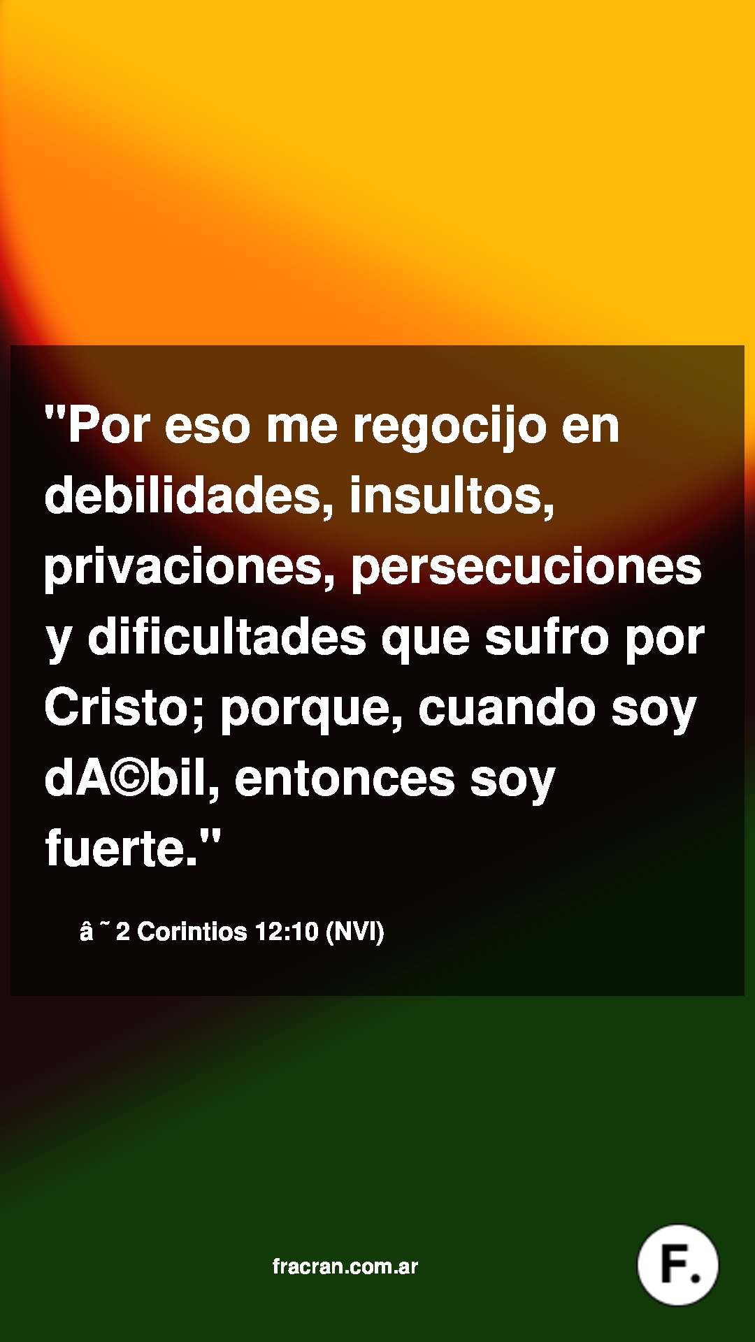 Por eso me regocijo en debilidades, insultos, privaciones, persecuciones y dificultades que sufro por Cristo; porque, cuando soy débil, entonces soy fuerte.